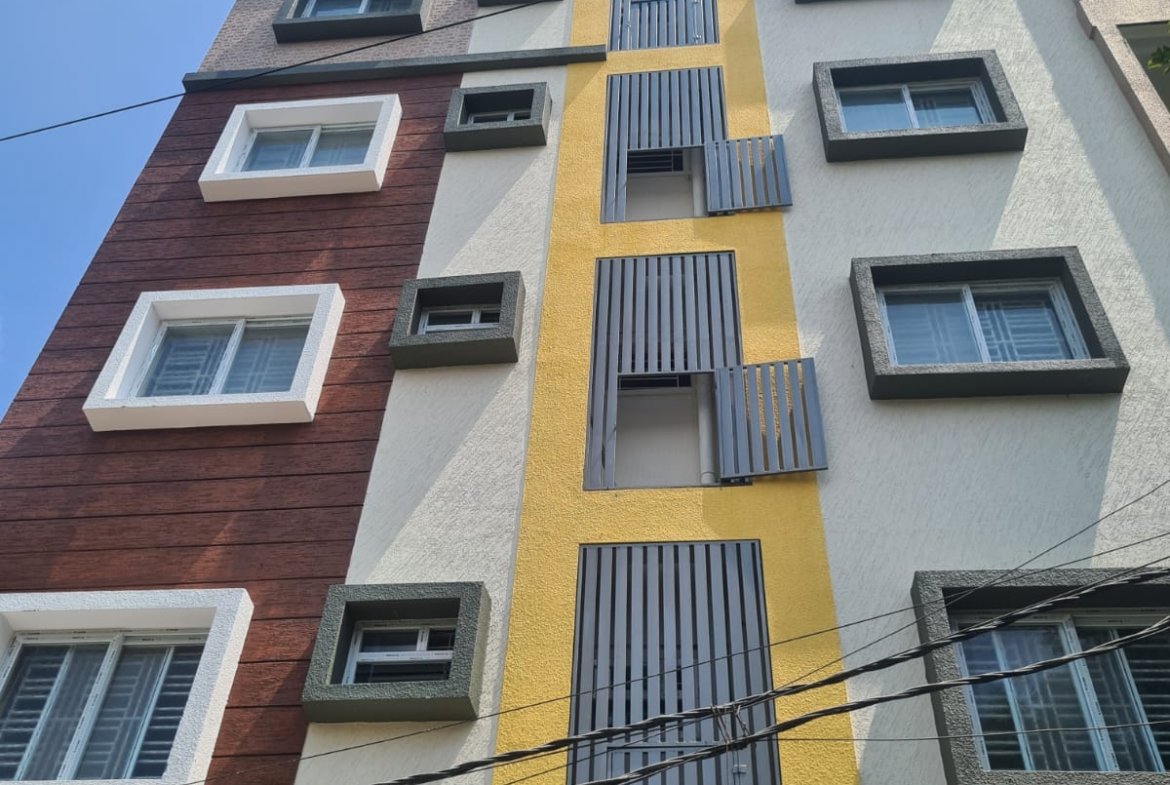 This premium G+4 apartment building is constructed on a 2800 sqft west-facing plot, with the ground floor fully dedicated to parking. Each floor consists of two east-facing flats, measuring 1300 sqft and 1400 sqft respectively. Every apartment comes with three spacious washrooms (two attached and one common), a balcony, and a separate utility area for washing and storage.
